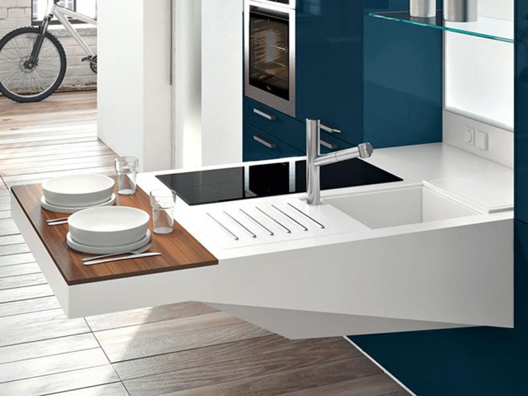 Este aspecto responde a la tendencia cada vez más marcada, especialmente entre los jóvenes, de vivir la preparación de la comida como un factor de fuerte valencia social, momento de encuentro y experimentación. El bloque operativo, disponible en dos medidas, de 90 y de 120 cm, está totalmente equipado para las funciones de preparación, cocción y lavado, una solución ideal para estudios y mini-apartamentos.